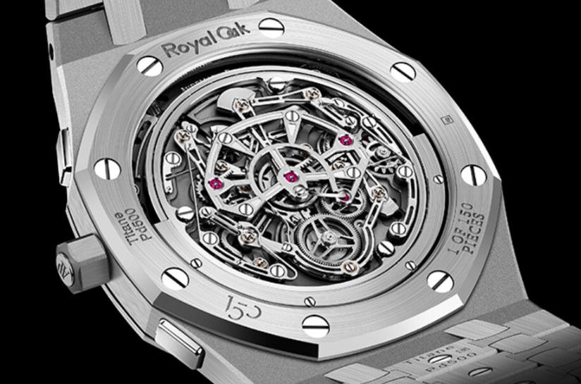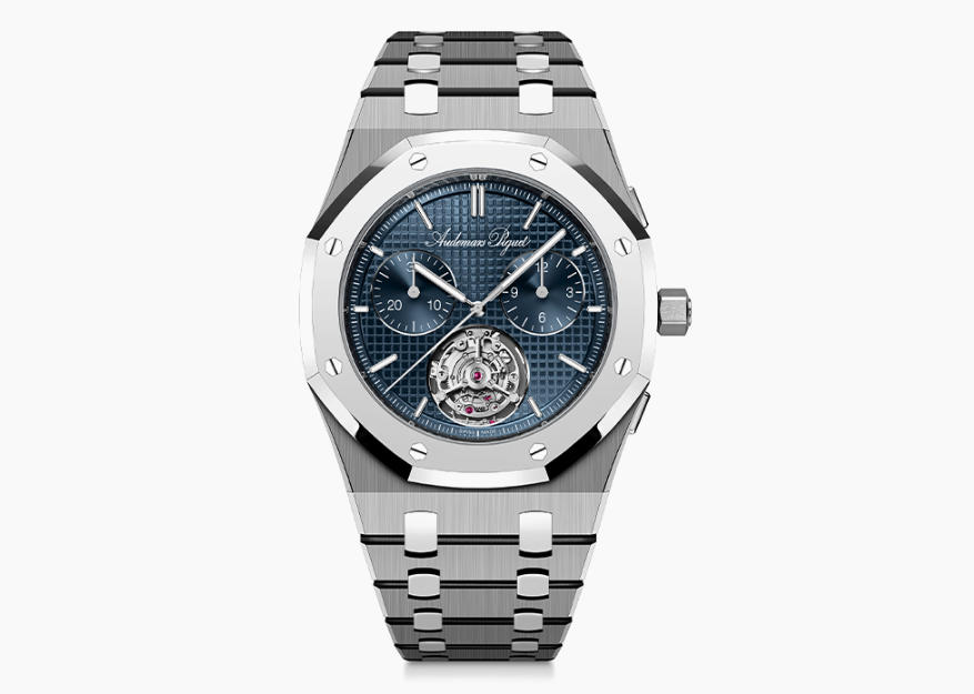 The case and bracelet combine titanium with AP’s proprietary Bulk Metallic Glass (BMG), a palladium-based alloy that’s scratch-resistant and lightweight. The bezel, pushers, and select bracelet elements use BMG, while the rest is brushed and polished titanium.