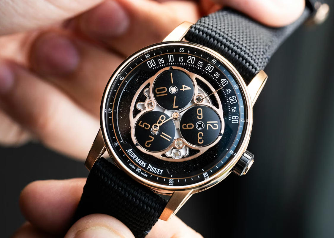 The wandering hours complication features a central, constantly rotating carousel, with three satellite hour discs containing all twelve hours. While the carousel turns, with the current hour at the top arrow pointing to the 120-degree minutes track, the other two “inactive” satellites continue to rotate, with the upcoming hour pivoting into position on the next disc thanks to the star-shaped gear underneath each. It’s a more understandable mechanism in the 90s version, with the transparent discs showing the full system underneath and revealing how the watch got its name. Here, in the top replica Audemars Piguet Code 11.59 Starwheel watches, the whole system takes the form of Calibre 4310, a modern in-house caliber with 70 hours of power reserve.