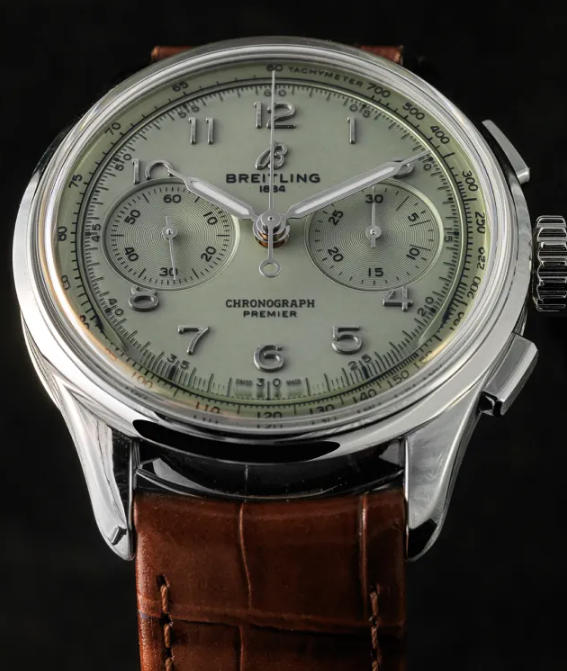 The dial layout is a bi-compax style, with the constant seconds sub-dial at 9 o’clock and the 30 minute chronograph counter at 3 o’clock. Both sub-dials feature concentric circles as a decoration and also to offer some visual relief to the otherwise smooth dial. The hands are syringe shaped with infilled SuperLuminova. The seconds hand is a thin needle like affair with the counterweight end in a circle. The rehaut is sloped with tachymeter markings. A railway style minute scale resides inside and just a small step below the level of the tachymeter, and the appliqué Arabic numerals offer the hour markings within. This dial visual is familiar to the other Premier line 42mm chronographs, and is very pleasing to the eye. Legibility is good, and the markings are clear. We do know that some will lament that the 2, 4, 8 and 10 numerals are cut by the sub-dials, but this does not bother us, and we rather like the aesthetics. Others will rejoice that the top replica watches comes sans date. A curved B logo without wings adorn the pride of place in the center of the dial above the transfer printer moniker “BREITLING 1884” in two lines.