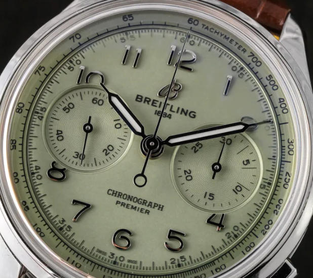 The dial is a rather pale pastel green, which Breitling calls pistachio green – a fitting name for the very attractive hue, especially when coupled with the brown alligator strap. A box style sapphire glass crystal protects the dial, and completes the vintage feel.